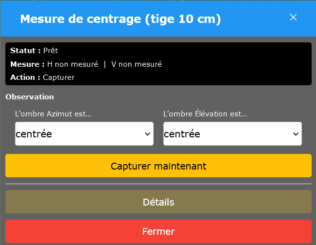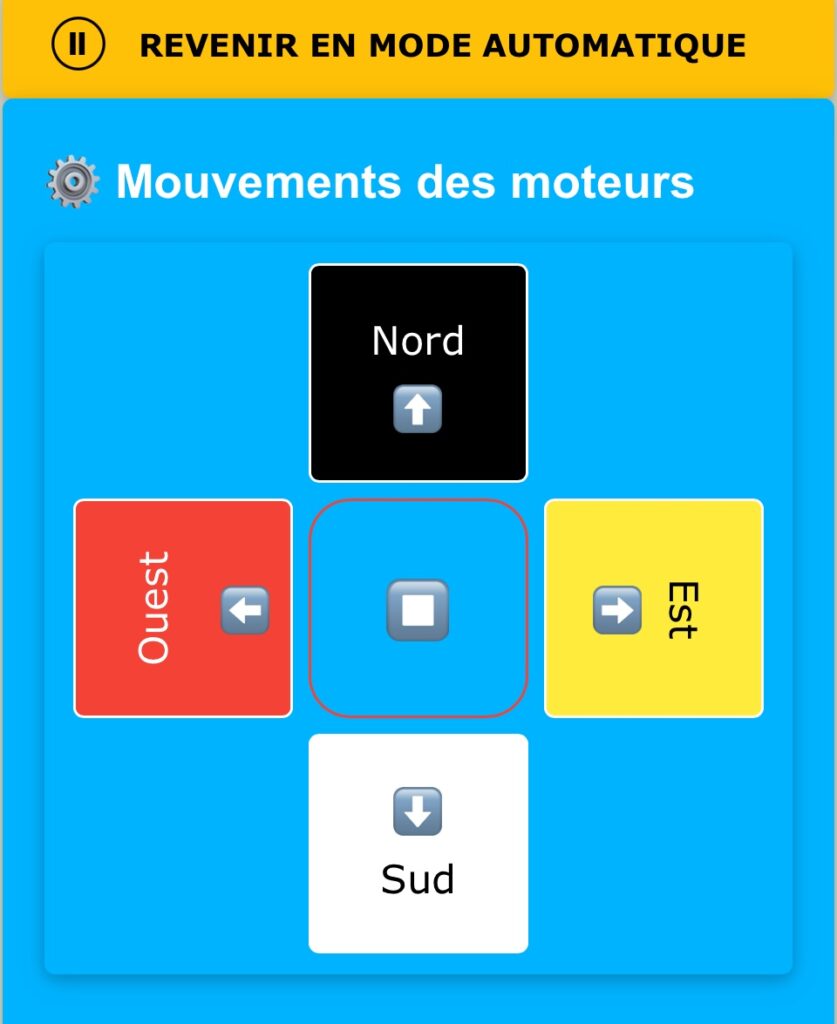 La première action est de déplacer les vérins avec les boutons “Nord/Sud/Est/Ouest”. Un clic sur le même bouton actionne/stoppe le vérin. Le bouton du centre stoppe les deux moteurs simultanément.