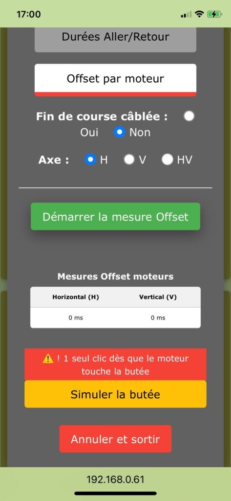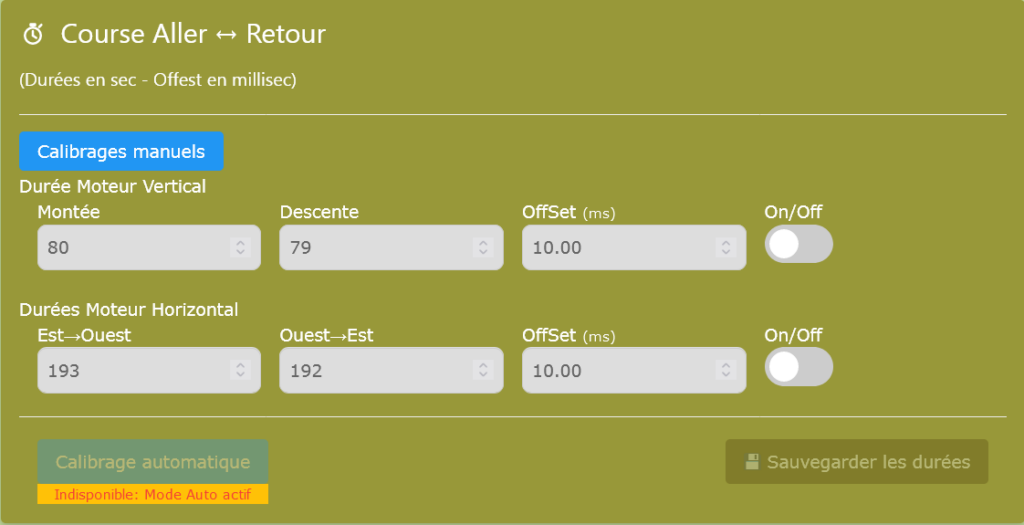 Mesurer automatiquement les temps réels des courses (aller + retour) pour chaque axe, afin de remplir les durées moteur utilisées ensuite par le système.