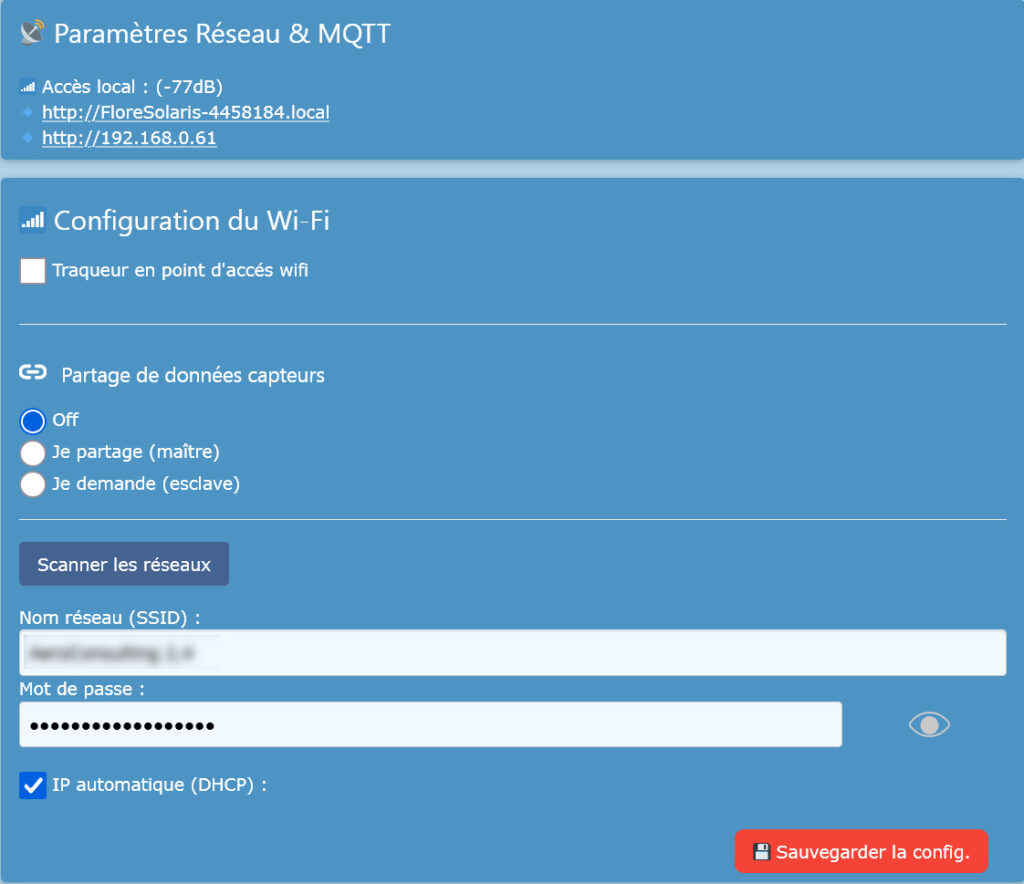 - Tu peux laisser DHCP activé si ta Box attribue un IP fixe à chaque nouvel appareil. Sinon, décoche DHCP et saisie l’IP pour ton Traqueur et celui de la BOB (Gateway).