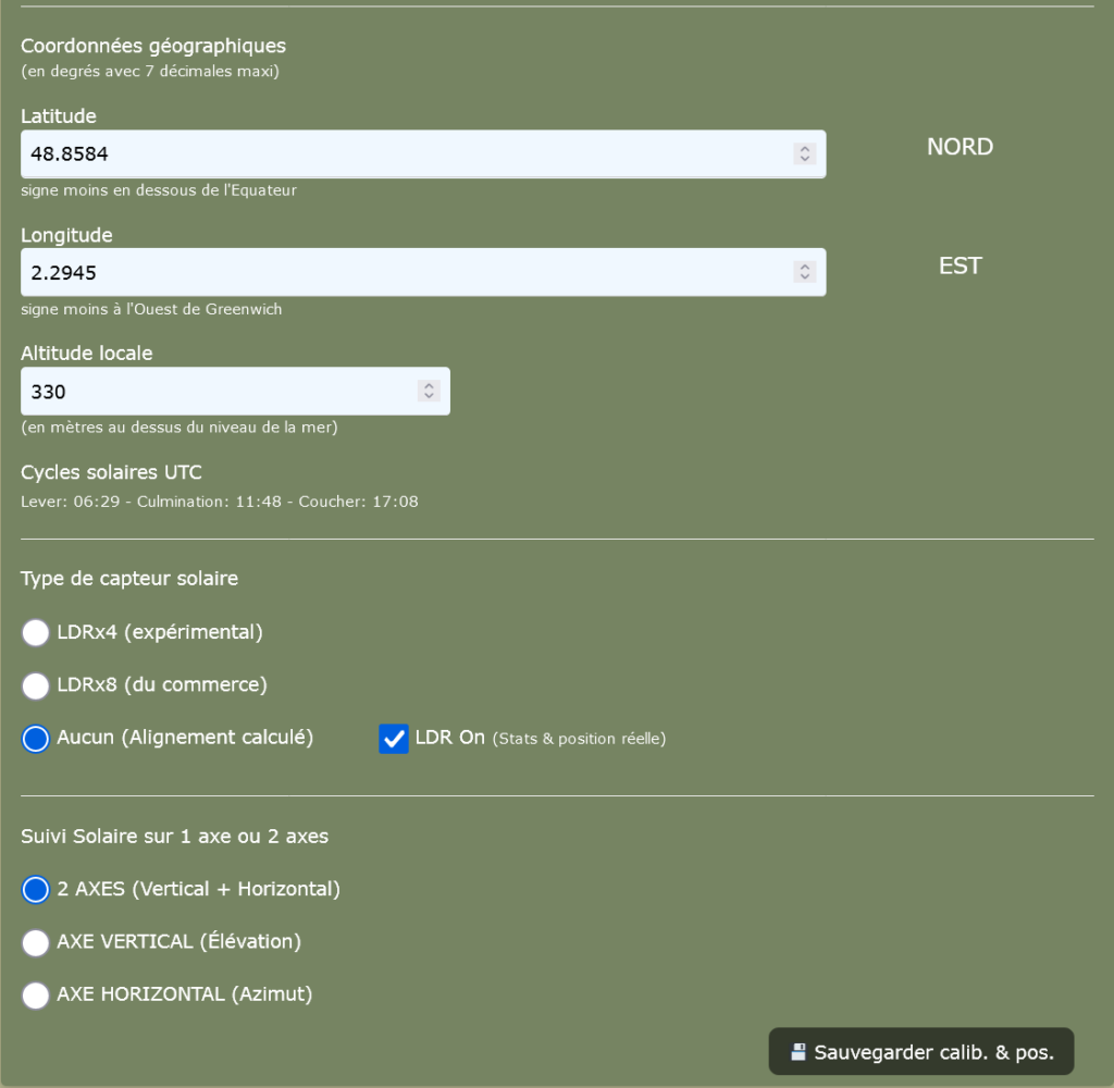 - Coche le mode de suivi solaire. Si un capteur est connecté, il peut être utilisé soit pour l’alignement, soit pour comparer la position calculée et la position réelle par grand Soleil.